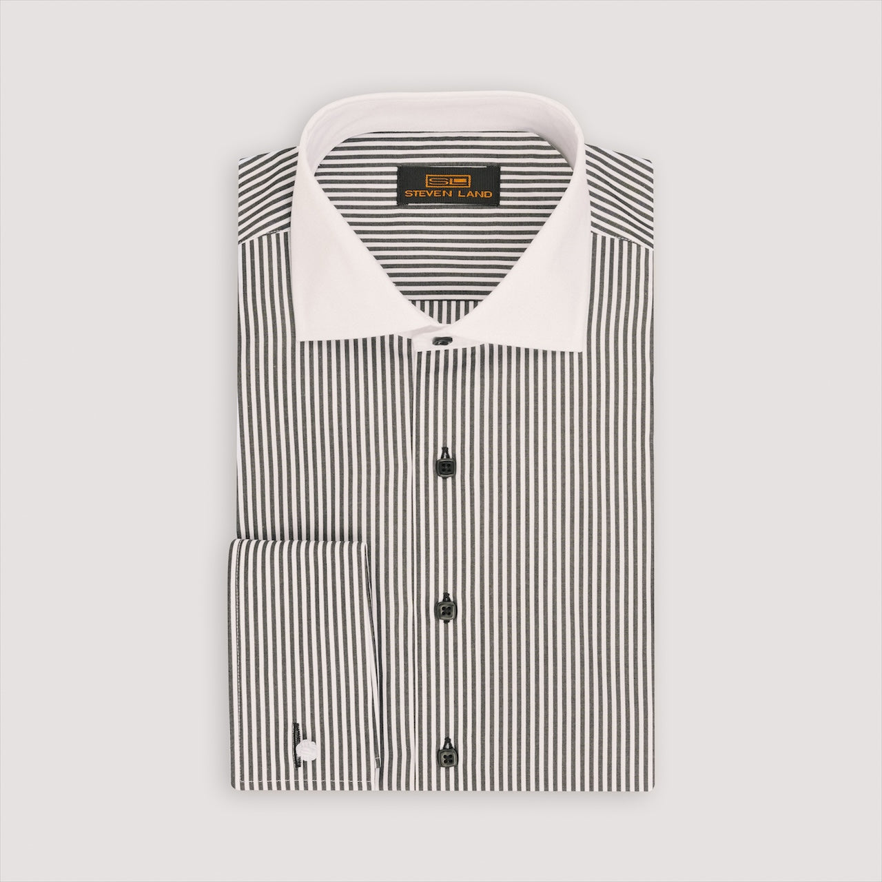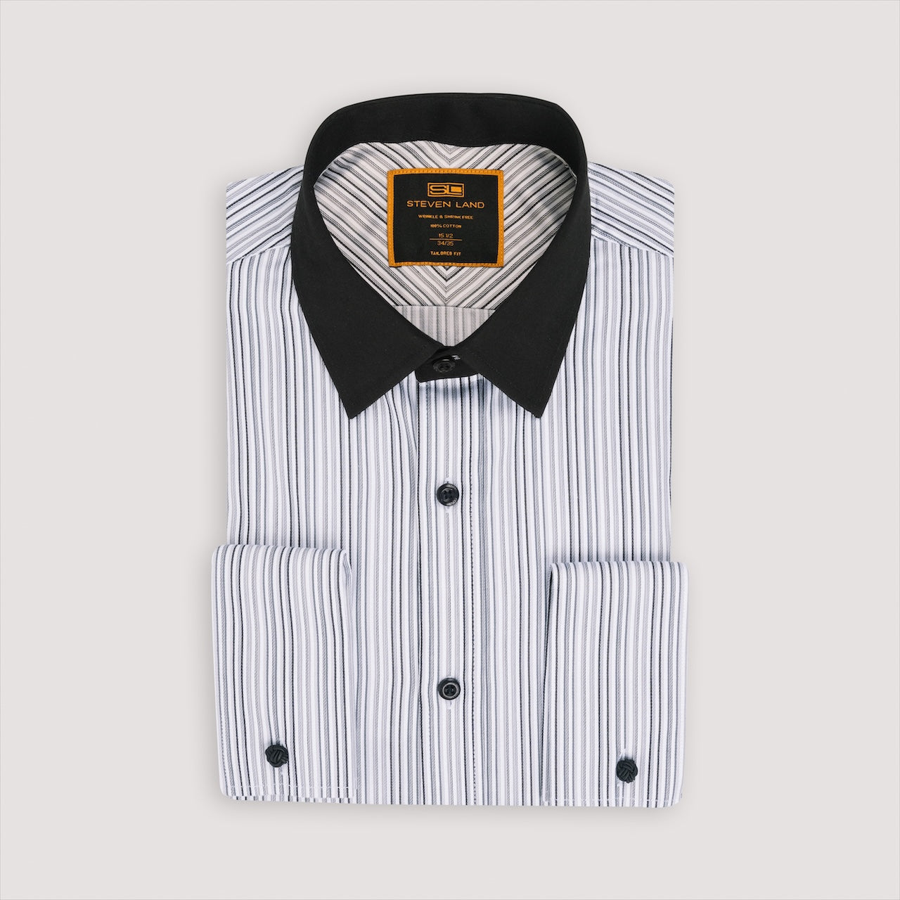 The dark, solid collar of the black Contrast Collar Dress Shirt brings attention to your face, while the tasteful vertical stripes keep you looking slim in your formalwear. Increase the appeal of this formal dress shirt by adding luxury cufflinks like the silver Tartan Knight Cufflinks Set. Wearing these cufflinks make you feel as brave as a knight while the silver cast melts seamlessly into the black striped details of the French cuffs, creating a chic and sleek pairing that you’ll want to wear at every special occasion this Fall season.