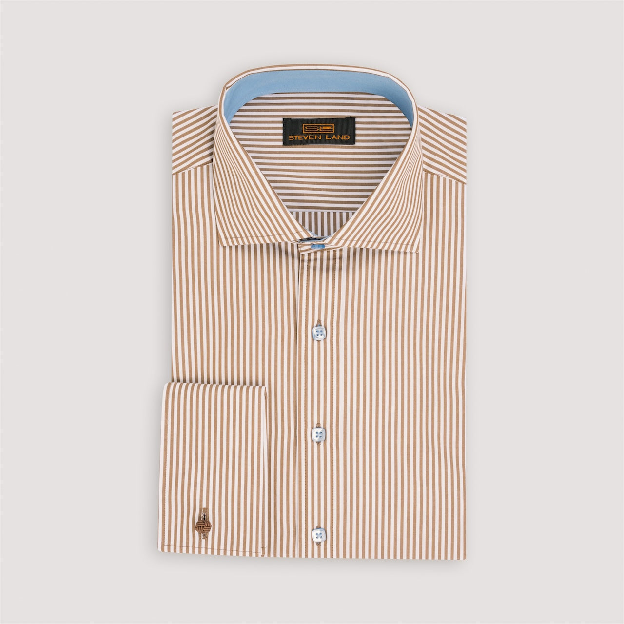 Similar to the Corcoran, the brown Callum Dress Shirt features slimming stripes and square buttons that add bespoke detail to your formal wear, but the light blue contrast interior lining of the spread collar and French cuffs add a twist that can’t be found in other menswear options. Decorate these French cuffs with the modern Star Cluster Cufflinks Set. The abstract arrangement of blue ombre stones glitter like jewels and match with the light blue buttons to elevate your formal attire.