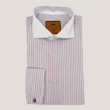 This perfectly understated striped dress shirt keeps things interesting with it's contrast white collar that pulls the attention to your face. Angled French cuffs are sure to elevate your formalwear (and make it easy to roll up your sleeves).