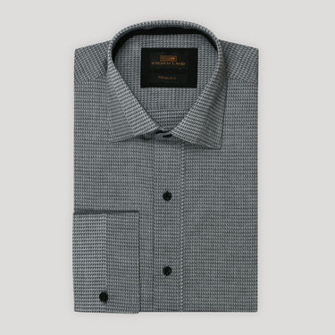 Triangles are woven into the premium quality fabric that forms this shirt. Pieced details highlight this shirt’s lustrous weave.