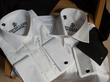 Let your dress shirts serve as a statement piece with this luxuriously decorated formal attire. Tastefully spaced crystals adorn the collars, cuffs, plackets, or chest of these limited edition shirts. The diamond-like effect results in a dazzling catch of the light that is sure to add an unforgettable twist on your traditional special-occasion outfits.