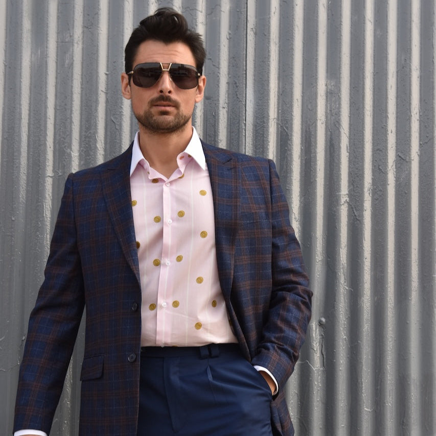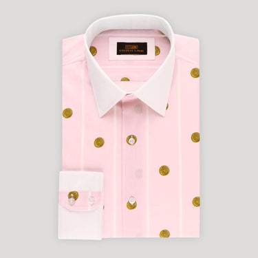 This one of a kind all over medallion shirt is inspired by the pendants the Greek Gods worn in the 18th Century. Featuring thin vertical stripes, a solid collar, and a novelty barrel cuff for the ultimate Greek god look.
