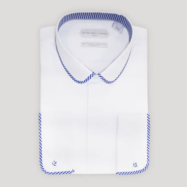The Hudson Dress shirt is an elegant Hoover style collar with soft contrasting houndstooth trim. Featuring Hidden Front Placket, Rounded French Cuffs with matching two tone Silk Knots. A perfect example of how “Clothes Make the Man”