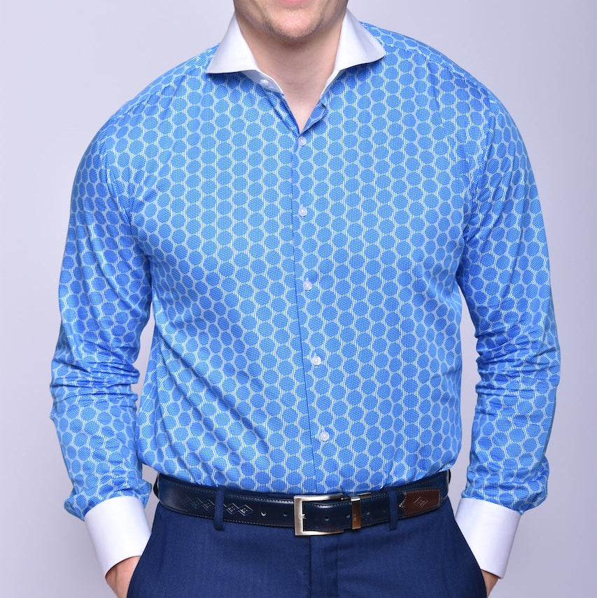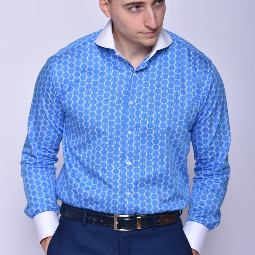While not as overtly bold as a solid dot, this cross-hatched dot pattern is more textural and nuanced. For the man who appreciates detail and quality in his shirts.