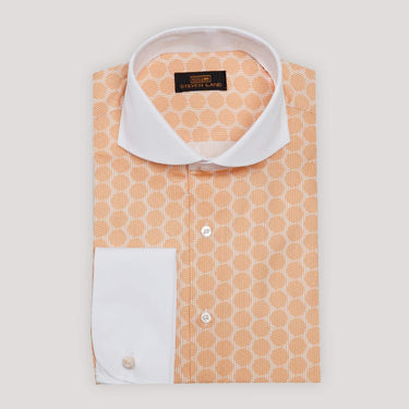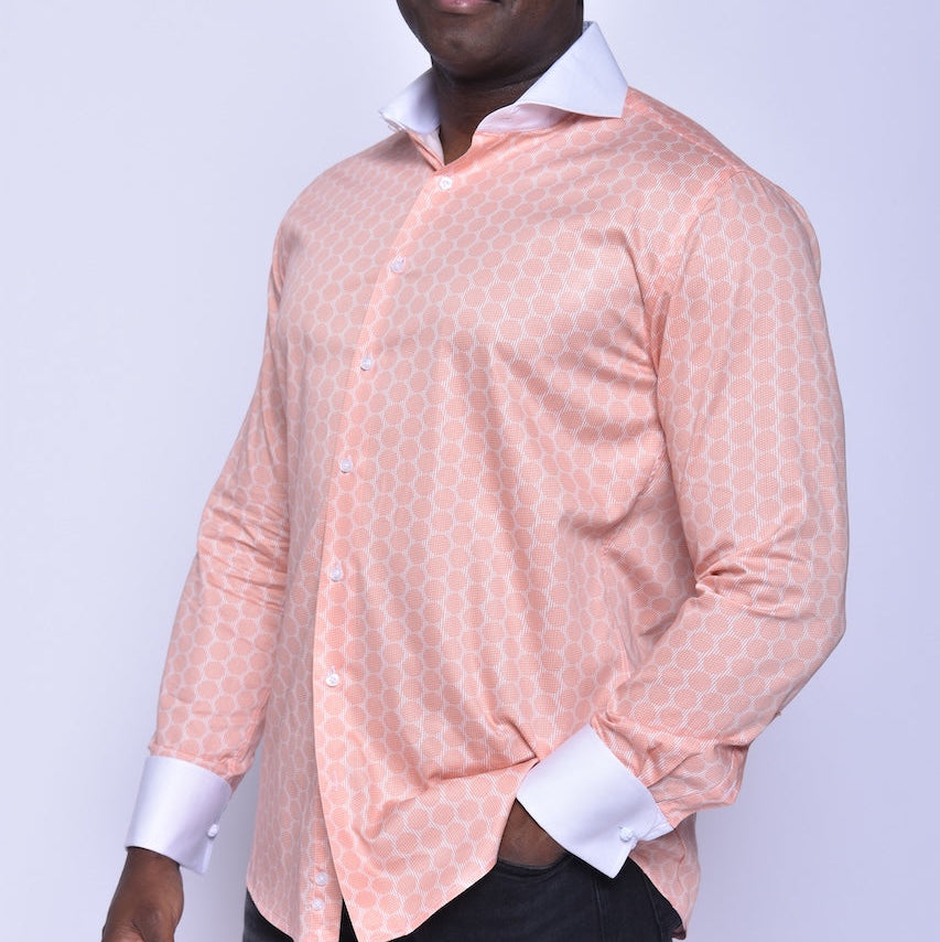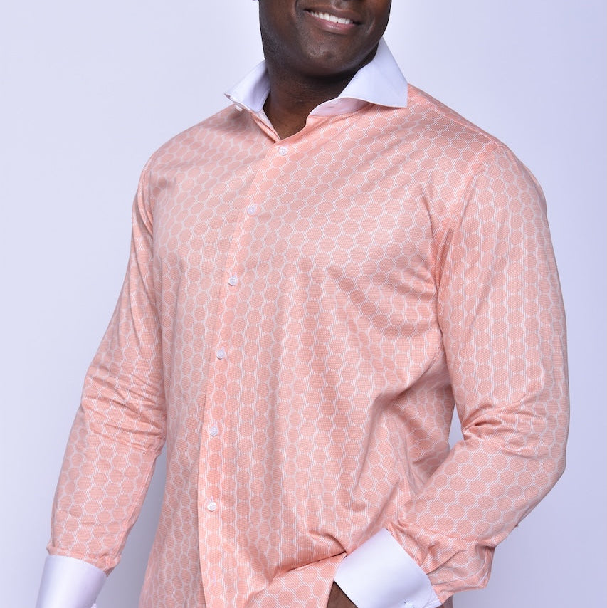 While not as overtly bold as a solid dot, this cross-hatched dot pattern is more textural and nuanced. For the man who appreciates detail and quality in his shirts.