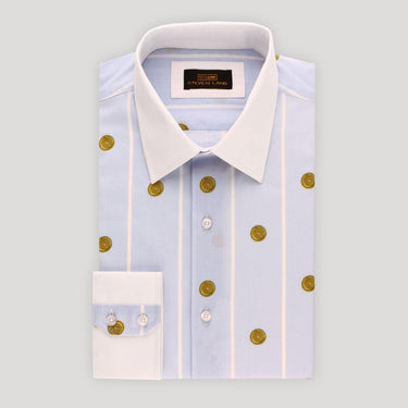 This one of a kind all over medallion shirt is inspired by the pendants the Greek Gods worn in the 18th Century. Featuring thin vertical stripes, a solid collar, and a novelty barrel cuff for the ultimate Greek god look.