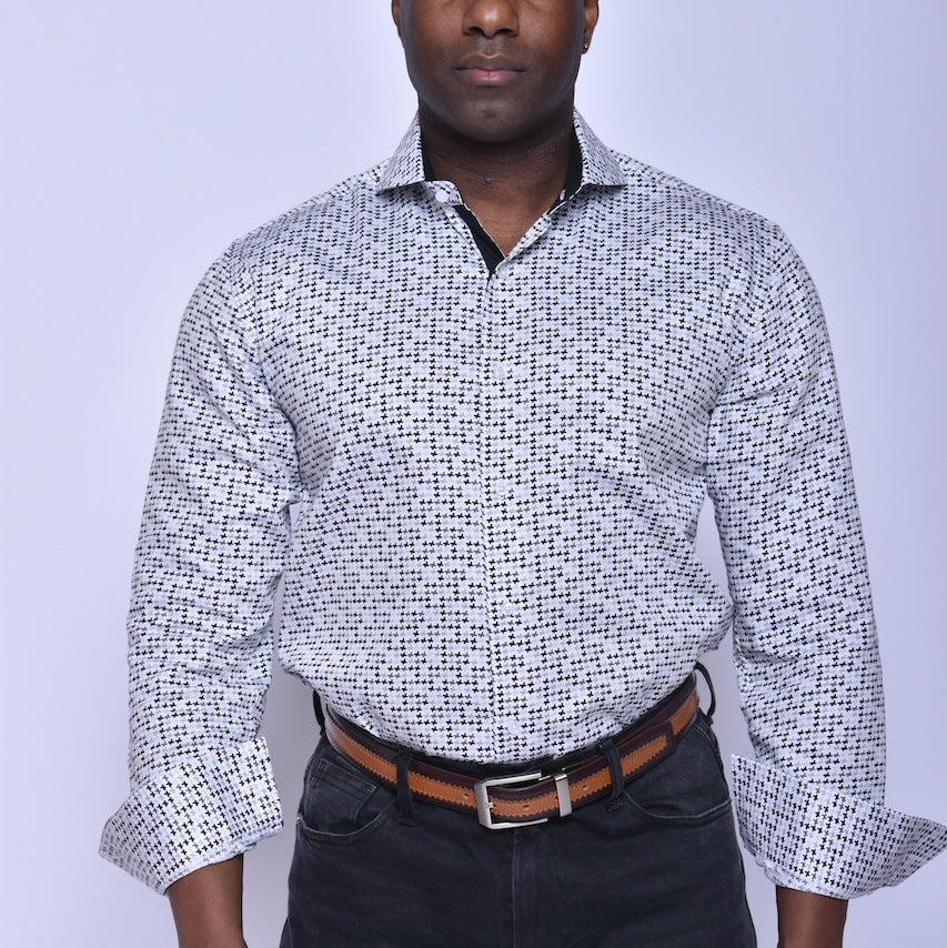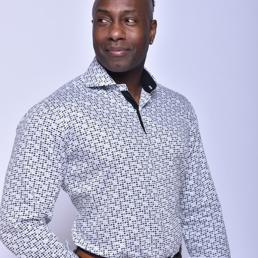 Classic hounds tooth is given the unmistakable Steven Land update for warm weather wear. We redesigned the pattern, added shots of bright color and playful personality for this fun printed shirt.