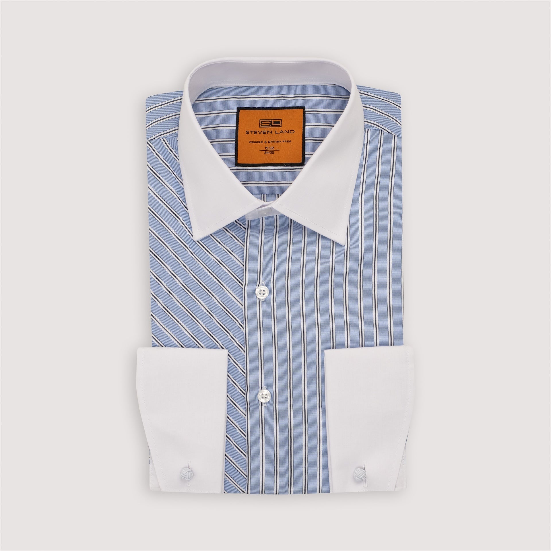 Bold contrast, timeless appeal. This distinctive dress shirt features a contrasting point collar with removable stays and matching French angled cuffs for a striking finish. This shirt features diagonal repp stripes that run at a slant across the fabric, creating a dynamic, directional pattern. A classic French Placket keeps the look clean, while the wrinkle and shrink-free cotton blend ensures effortless style. Stand out with confidence, no extra effort required.