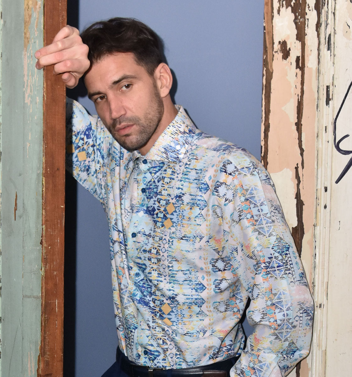 Ready for a vacation? Pack this vibrant printed shirt for your next beach getaway or wear it to your friend's rooftop party. With its traditional collar adorned with a contrasting print trim, it's the perfect choice for standing out, whether paired with khakis or jeans.