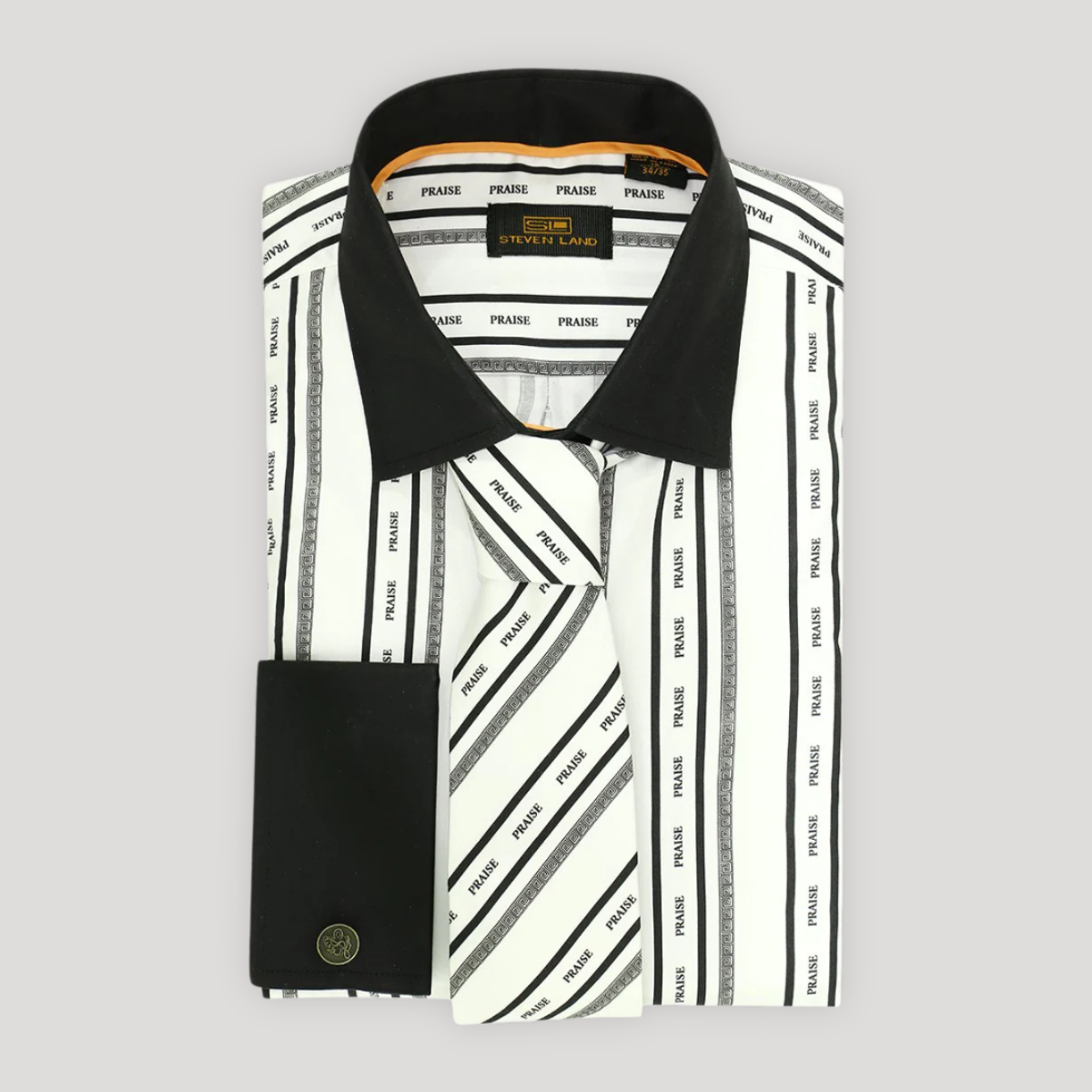 Praise Stripe Cotton Dress Shirt With Matching Mask, Tie, Hanky and Cufflink | Black