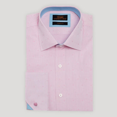 Two sizes of dots are layered on a ground of clean stripes on our innovative dress shirt. The dot pattern is so subtle it is only visible when turned into the light. Surprising yet elegant.