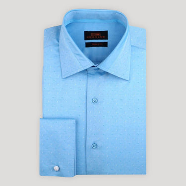 Tiny vivid dots are centered on a dobby patterned woven shirting. Coordinating solid fabric trim elegantly finishes the edge of the collar.